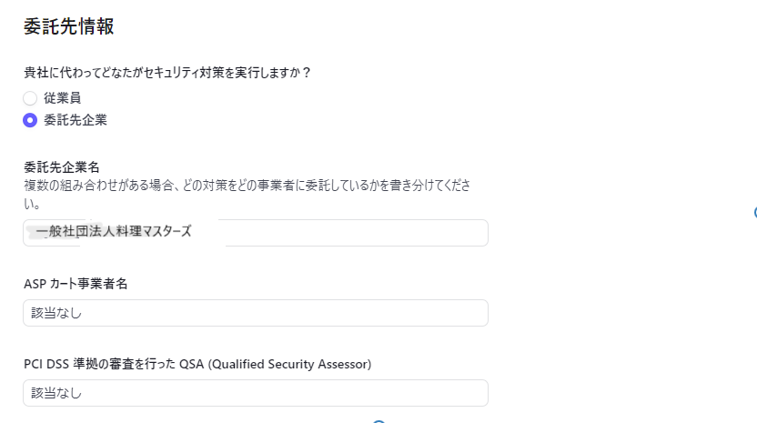 ASP カート事業者名とPCI DSS 準拠の審査を行った QSA (Qualified Security Assessor)は「該当なし」と回答します。